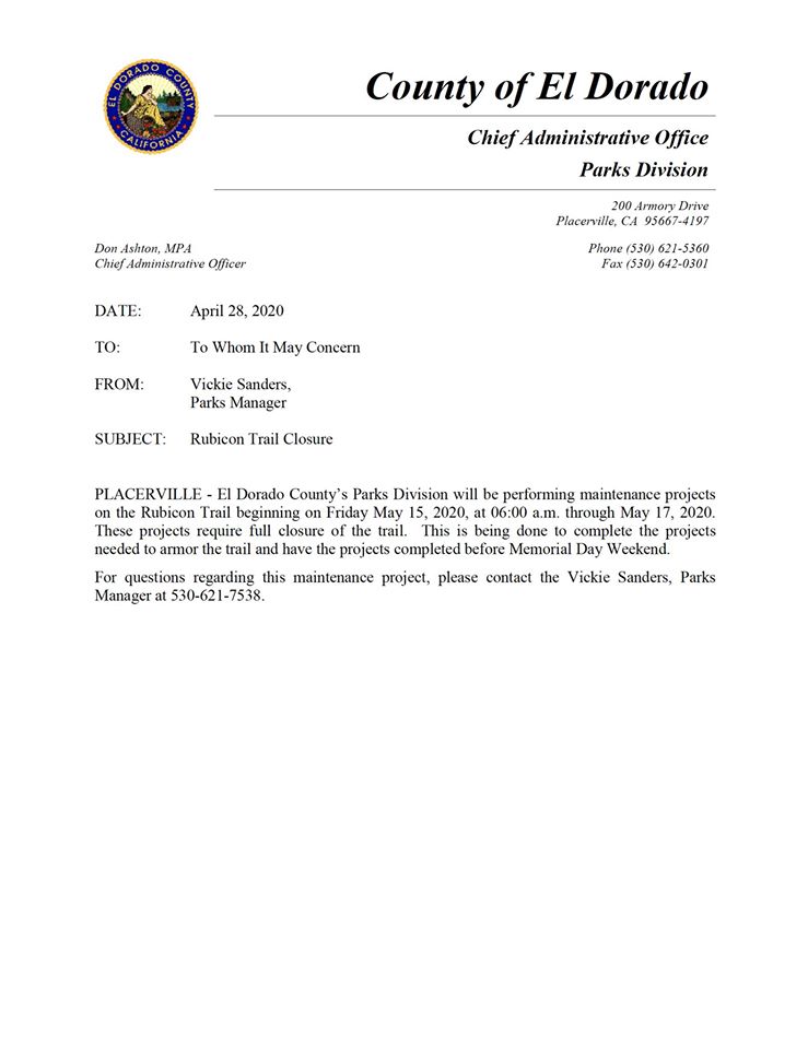 Posted: April 22, 2020 Filed under: Access, Maintenance, Travel | Tags: El Dorado County, meeting Leave a commentWith all this Covid-19 thing going on and the ‘stay-at-home’ orders, you would think I’d have a lot of time to post about the Rubicon Trail. Well the truth is there isn’t a whole lot going on right now.