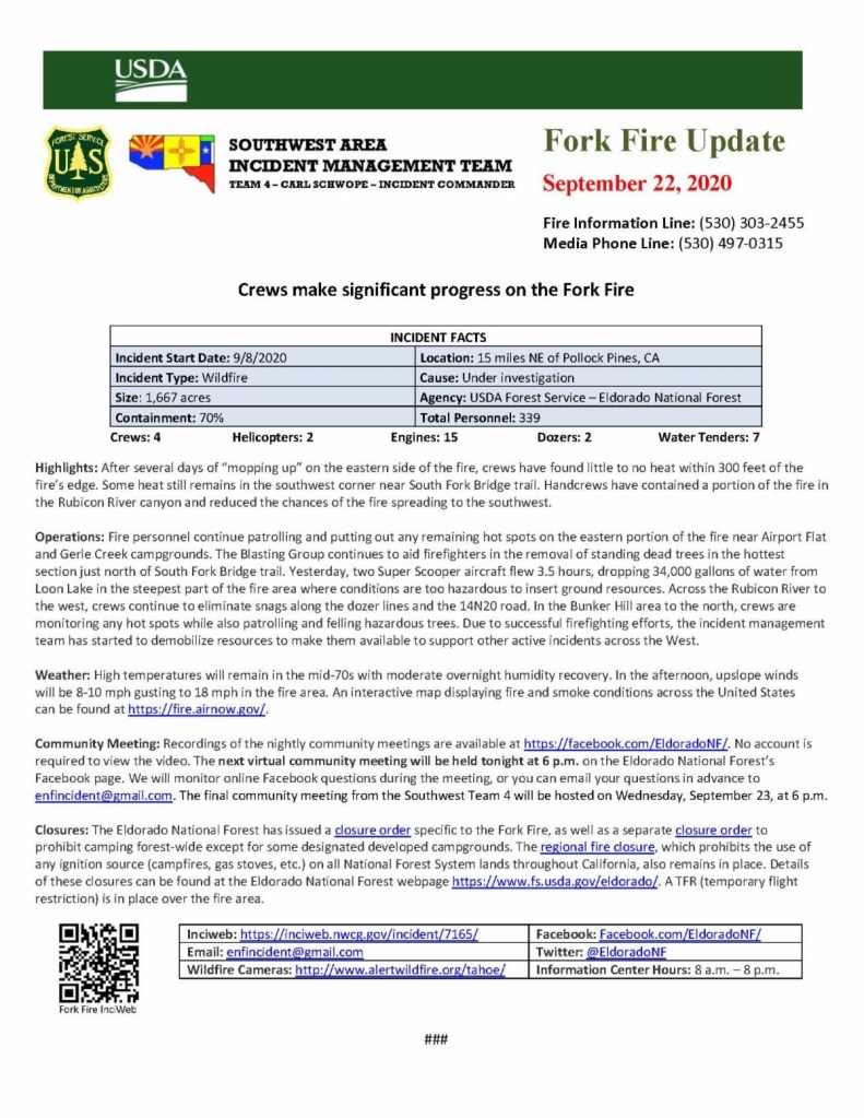 Posted: September 22, 2020 Filed under: Access, Travel | Tags: closure, fork fire Leave a commentThe Eldorado National Forest released the update below this morning: