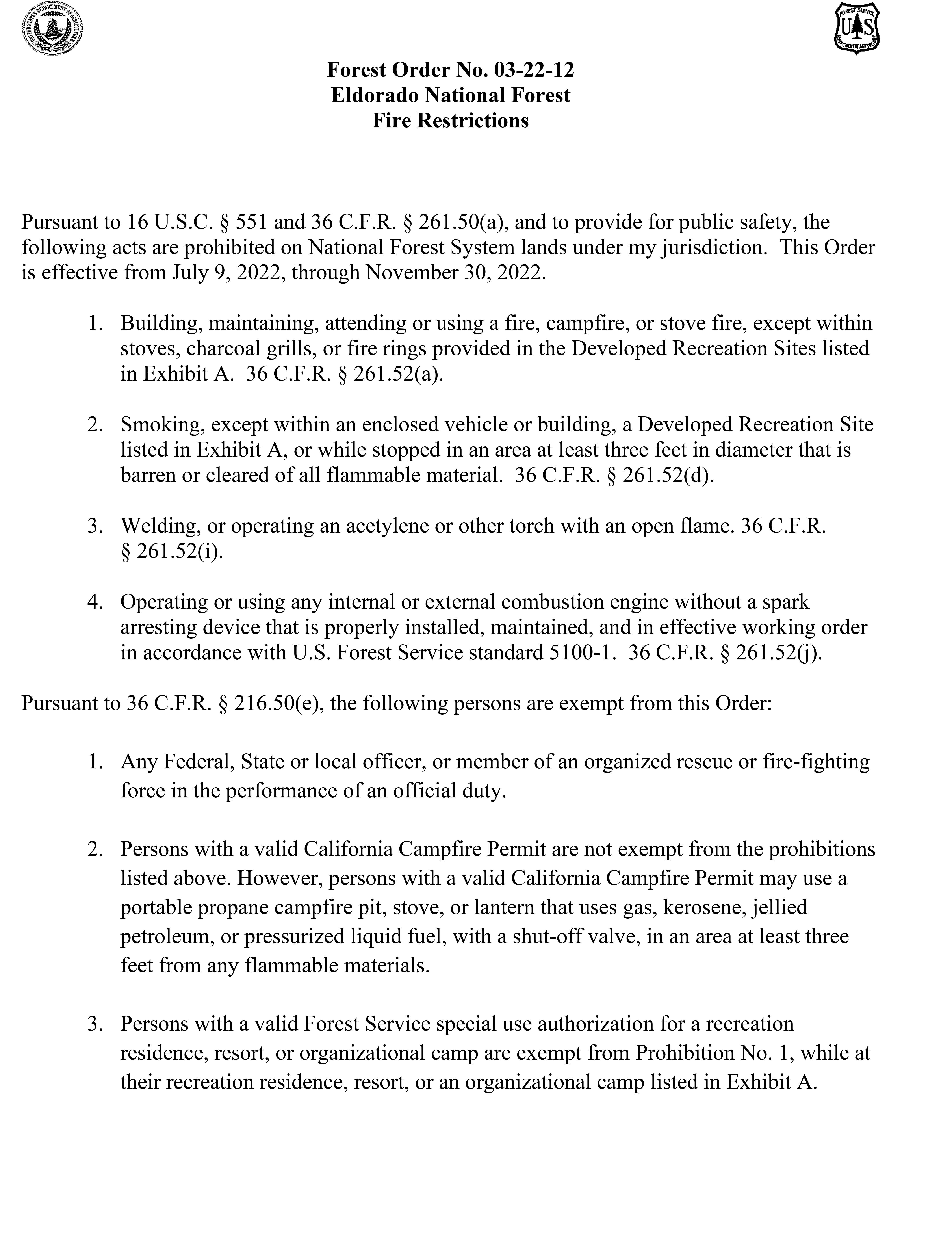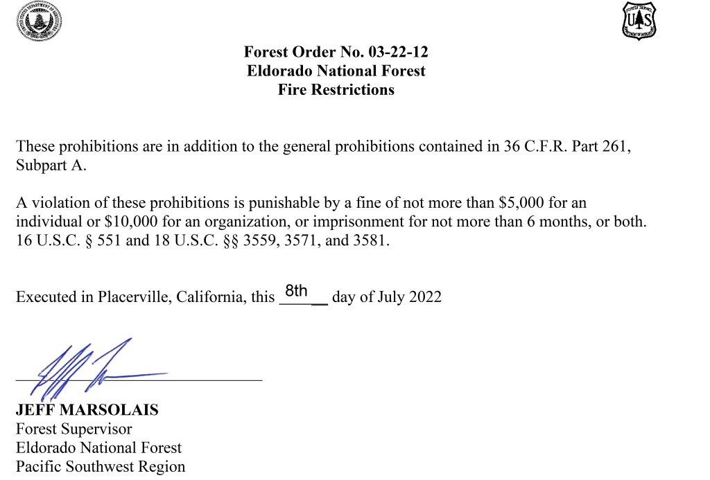 As of this writing, the Eldorado National Forest (ENF) has implemented fire restrictions regarding the use of fire, stoves and tools within their forest.