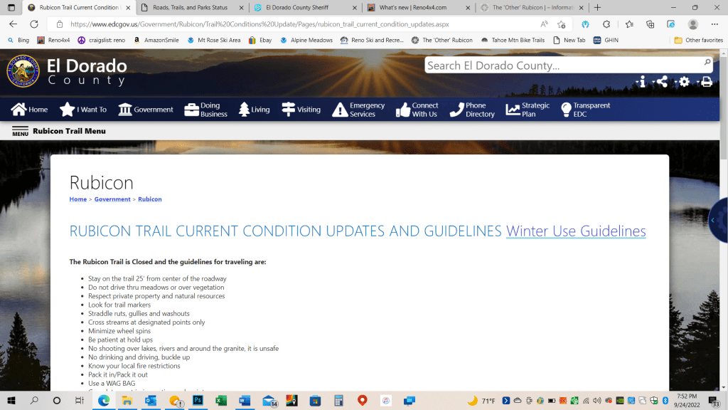 El Dorado County’s ‘Parks’ page and the subsequent ‘Rubicon’ page still have the Rubicon Trail as closed, but then lists the guidelines for traveling. “The Rubicon Trail is closed and the guidelines traveling are:” A little confusing.