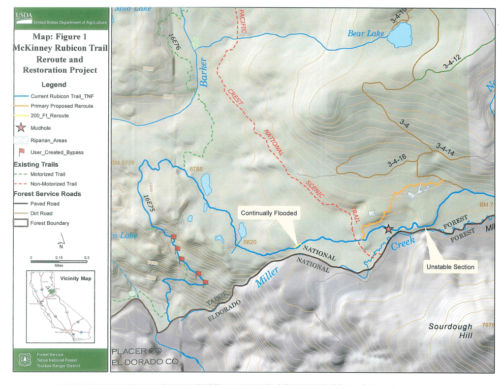 Placer County and Reroute – Due to the historic nature of the reroute the Forest Service is not entertaining any actions to decommission the existing route above Miller Creek and Miller Meadow, as well as to keep options open for Placer County. Forest Supervisor Eli Ilano and Truckee District Ranger Johnathan Cook-Fischer have both talked with the Placer County Supervisor for the relevant county district (Eli on multiple occasions spanning several years) regarding the fact that if Placer County wanted to assert jurisdiction or management of the Rubicon through the Tahoe NF, the Forest would work with them. That has not changed. It has been in Placer County’s court for a long time.