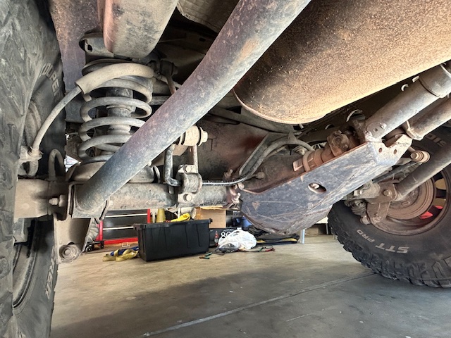 Two regular arms off the axle. The diff skid plate actually has an arm that goes forward to the crossmember. There is a trackbar on the backside from the passenger side of the frame to the axle behind/above the diff. Nth Degree even installed new upper coil spring cups to relocate the top of the spring for the best possible angle for improved flex without binding.