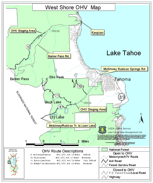 Here is list of OHV trails in the area of the Tahoe side of the Rubicon Trail. I’ve added a trail rating for each, going by memory as a guide. Every winter these trails can change. Explore with caution and remember “Turn Around, Don’t Go Around”, if you get to a section of trail you can’t negotiate.