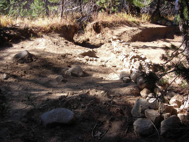 A quick water bar was installed in order to get the water to track across the trail. Again, it will need to be hardened by Placer County this summer.