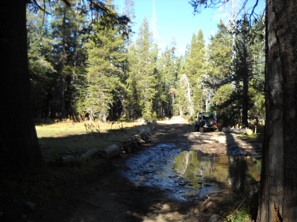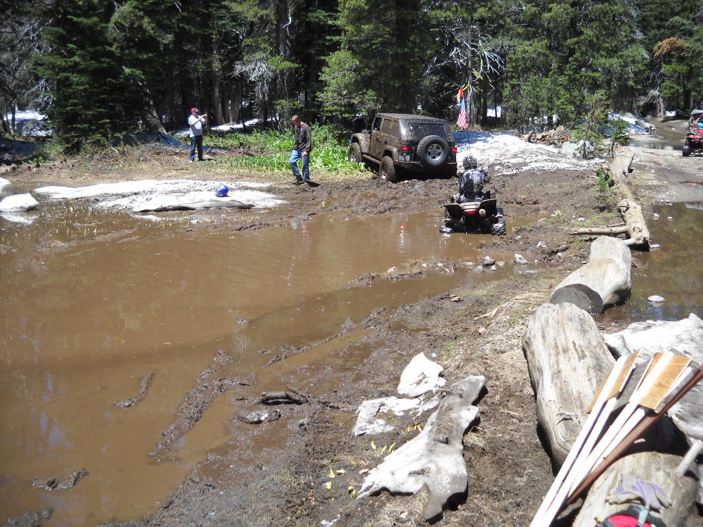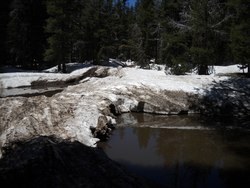 But the winter of 2010/2011 brought a HUGE and late snowfall. Wheelers were trying to get out on the trail and they encountered snow. Even July 1st there was still a lot of snow on the trail, as pictured below. Some people couldn’t make it over the snowdrifts ON the trail so they drove OFF trail. Remember, the log at the edge of the water and snow is the edge of the trail. All the tracks to the left of the log are off trail.