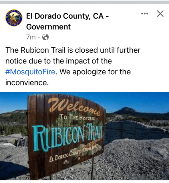 Due to the possible spread of the Mosquito Fire in the direction of the Rubicon Trail, El Dorado County has closed the Rubicon Trail until further notice. There is just a basic ‘closed’ statement on the county website.