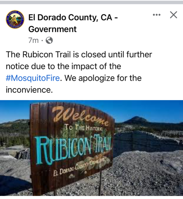 Due to the possible spread of the Mosquito Fire in the direction of the Rubicon Trail, El Dorado County has closed the Rubicon Trail until further notice. There is just a basic ‘closed’ statement on the county website.