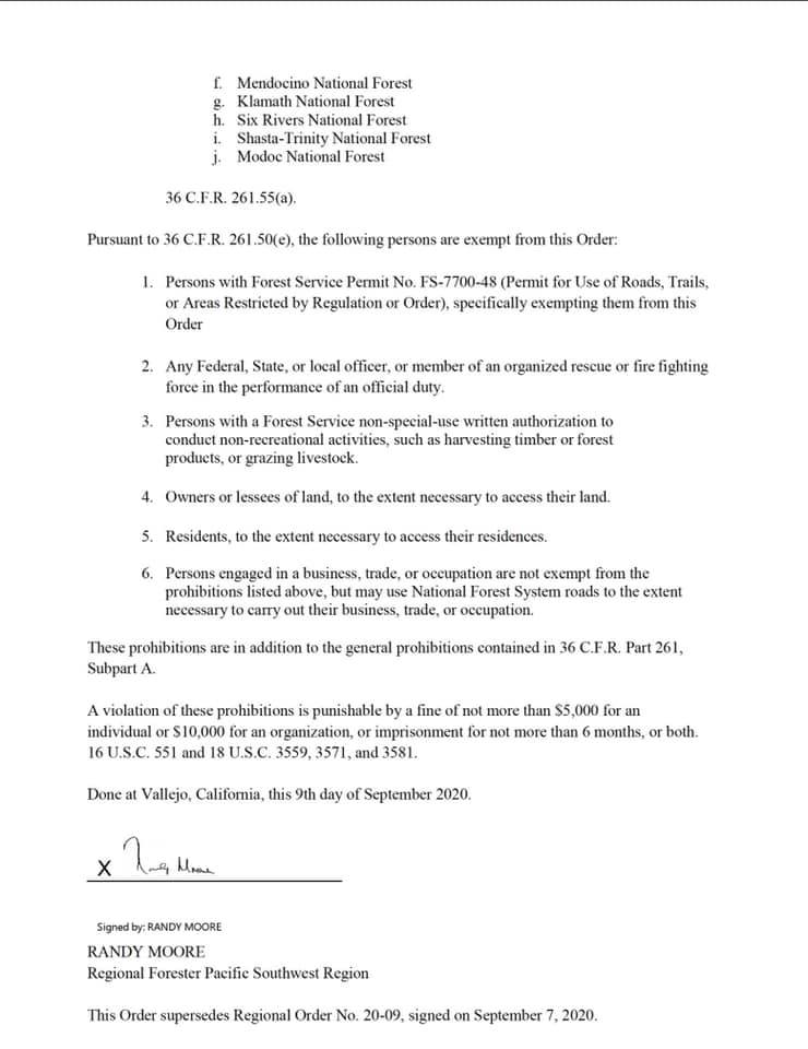 VALLEJO, Calif., September 9, 2020—Due to unprecedented and historic fire conditions throughout the state, the USDA Forest Service Pacific Southwest Region is announcing a temporary closure of an additional ten National Forests, meaning all eighteen National Forests in California are now closed. The closure of the additional ten forests will be effective at 5:00 pm today. These additional forests include the Eldorado National Forest, Klamath National Forest, Lassen National Forest, Mendocino National Forest, Modoc National Forest, Six Rivers National Forest, Plumas National Forest, Shasta-Trinity National Forest, Tahoe National Forest, and Lake Tahoe Basin Management Unit. This decision will be re-evaluated daily as conditions change.