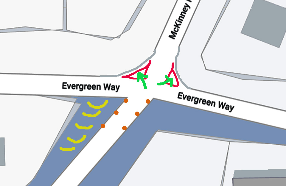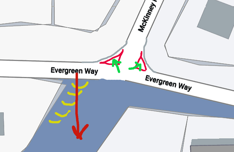 Explaining my markings: the yellow curves show the ditch to the north of the Rubicon trail, the red arrow shows how users accessed the trail last winter as Placer plow crews pushed snow from the intersection to the southwest corner of Evergreen and the Rubicon, the red triangles represents the snow in the intersection, the green arrows are where I’m suggesting Placer puts that snow.